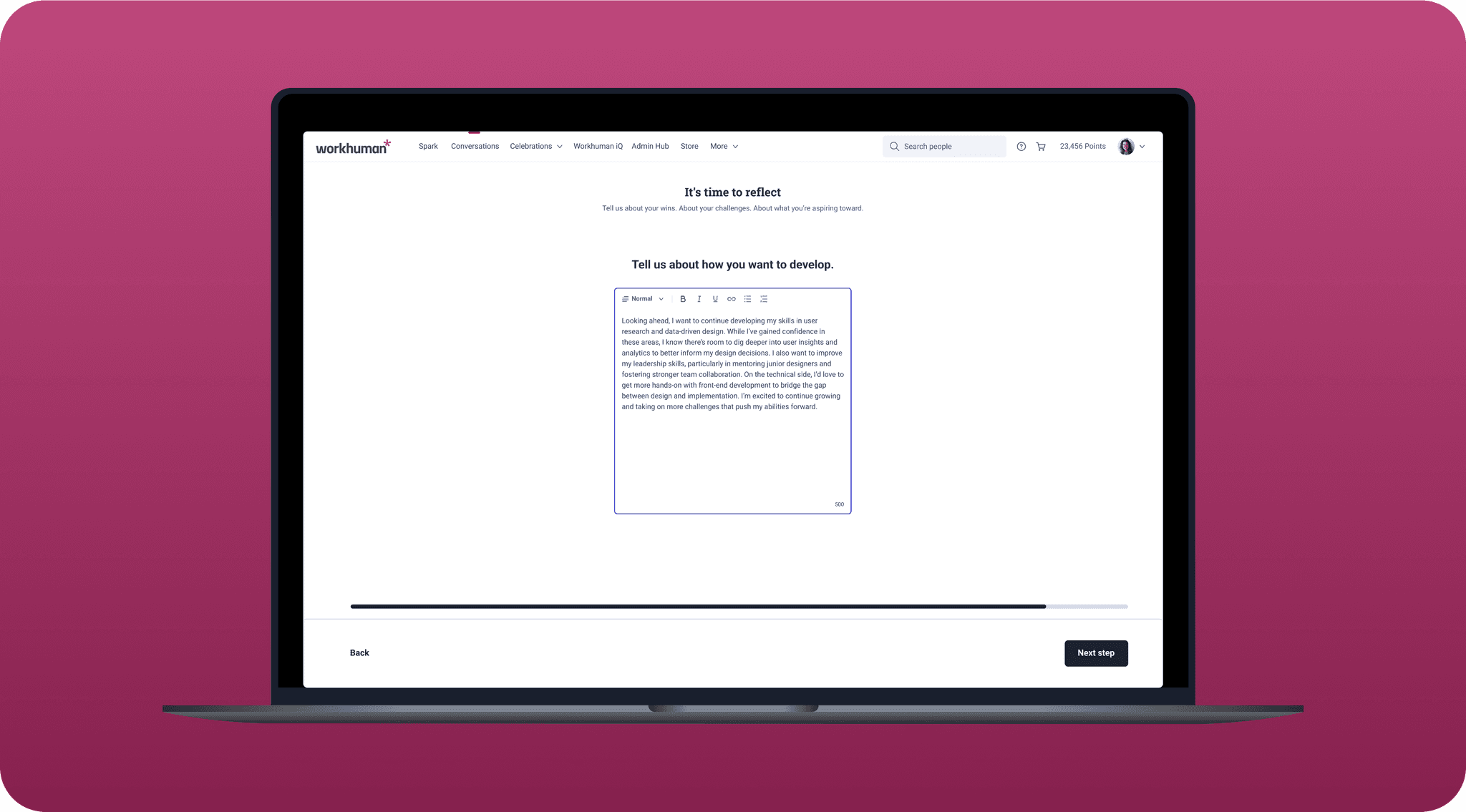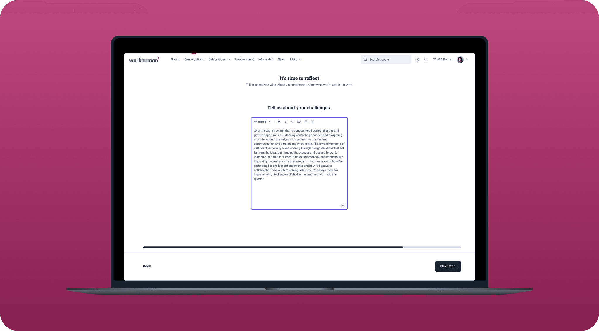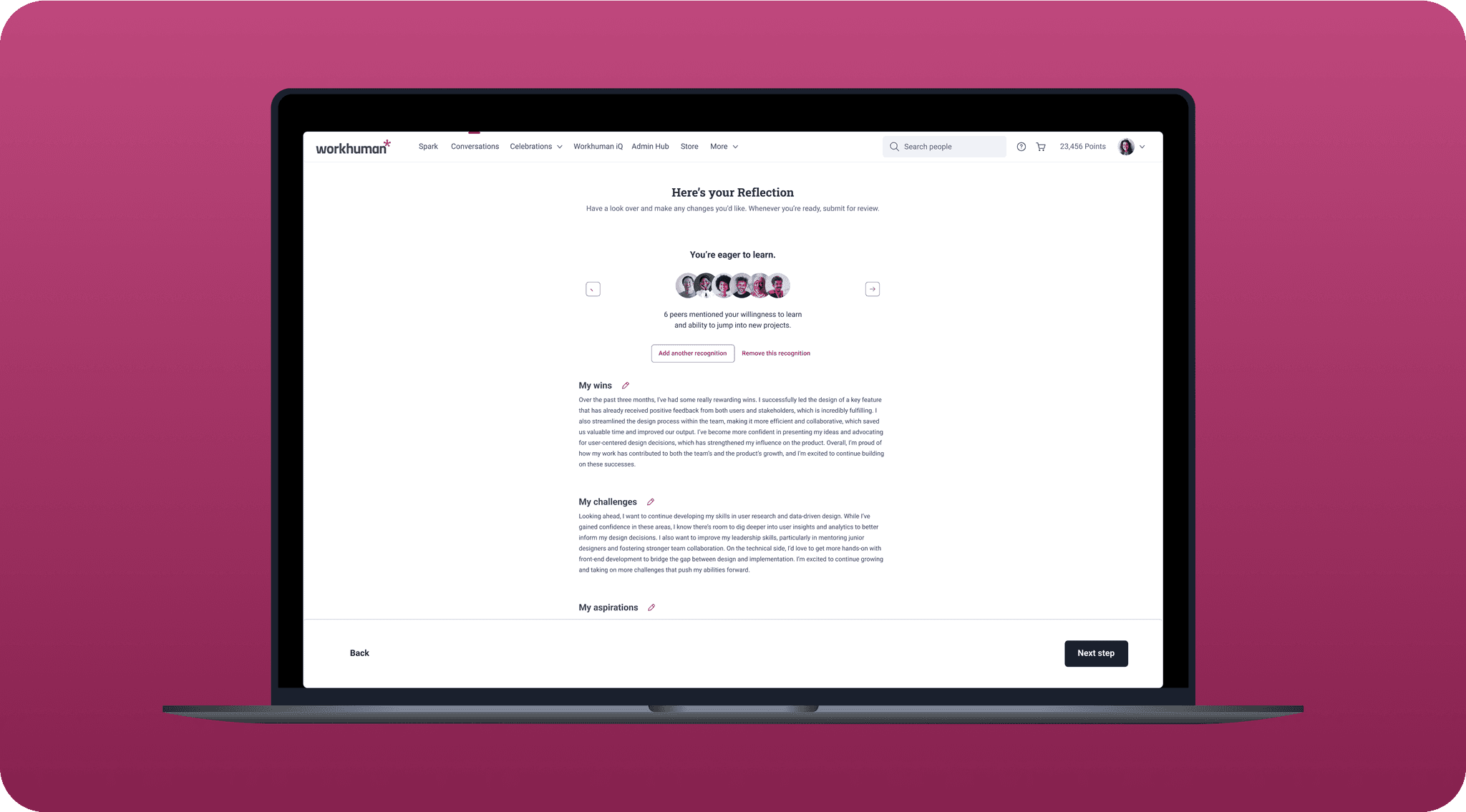 To further support users during the reflection process, I introduced nudges that encouraged them to include their recent social recognition moments. This served as a helpful reminder of what they had achieved over the past quarter, while also creating a stronger link between the Reflections and Spark products. By integrating these features, the redesign not only improved usability but also strengthened the overall product ecosystem.