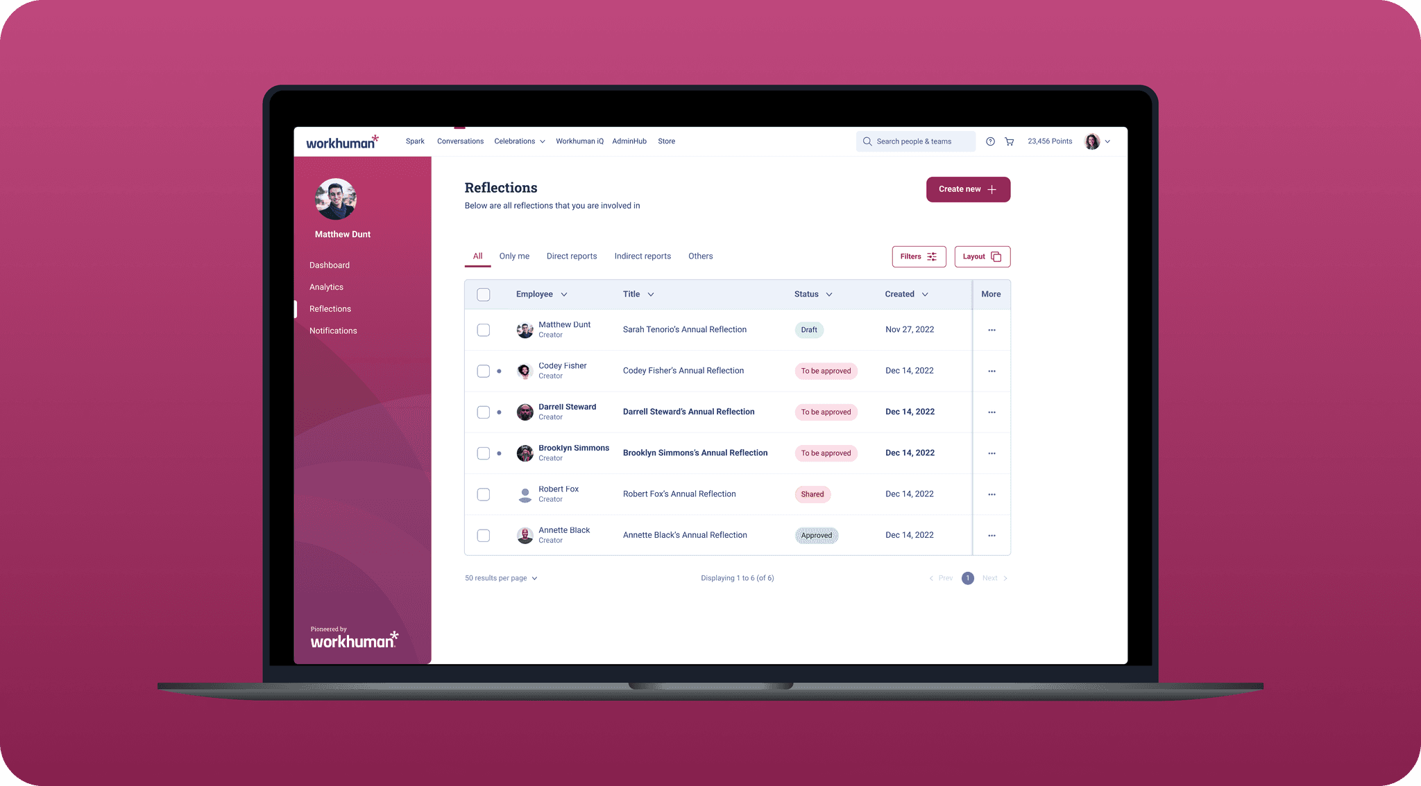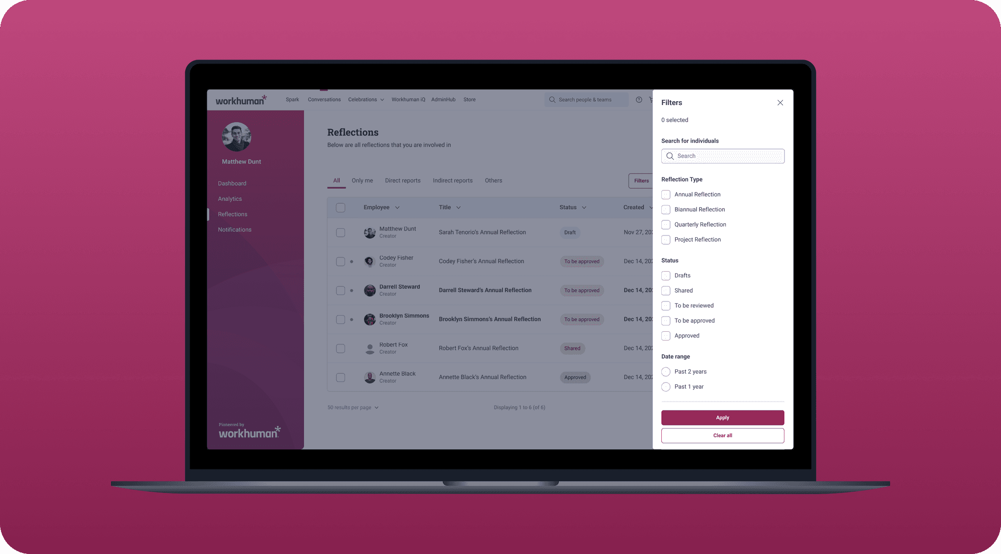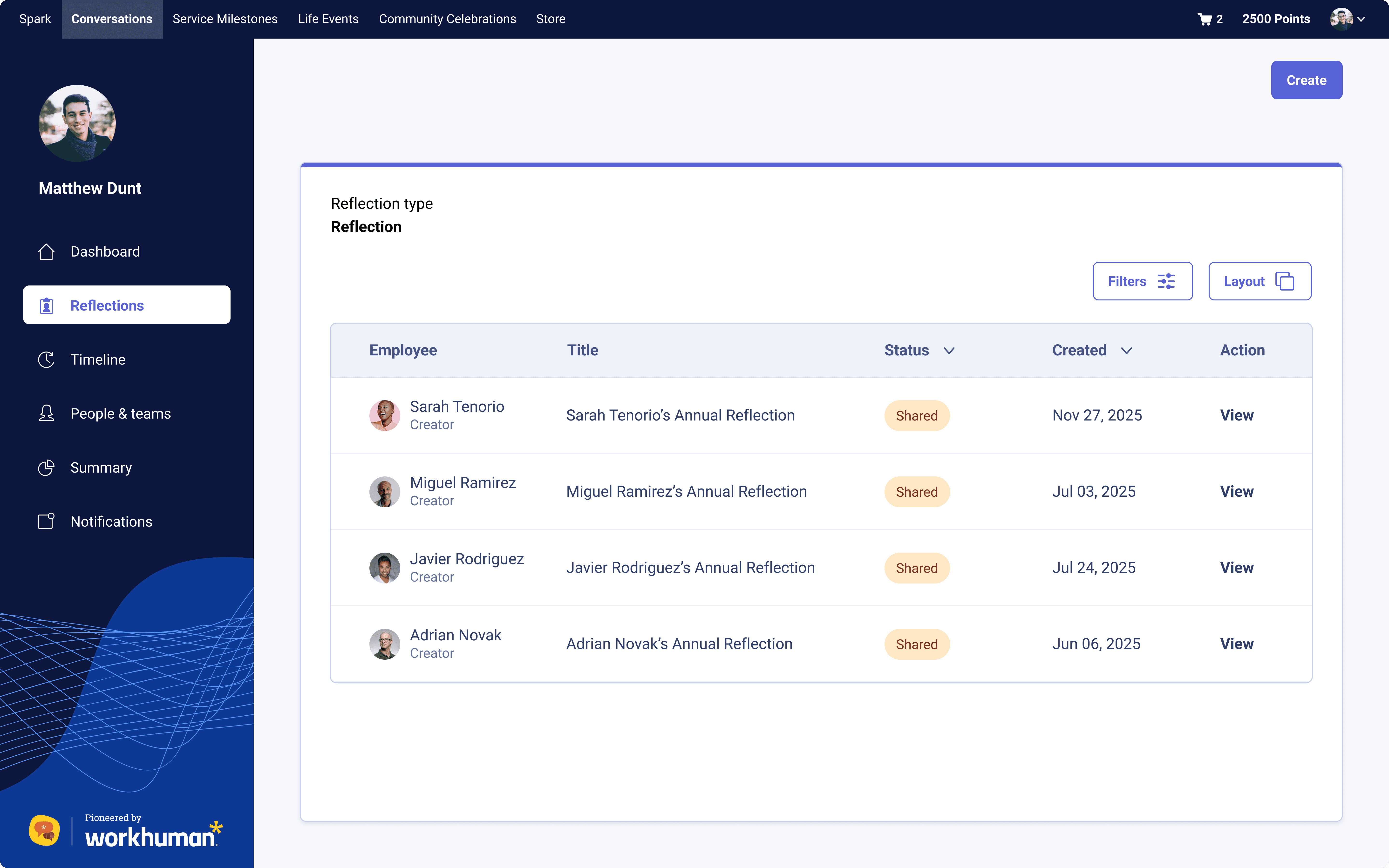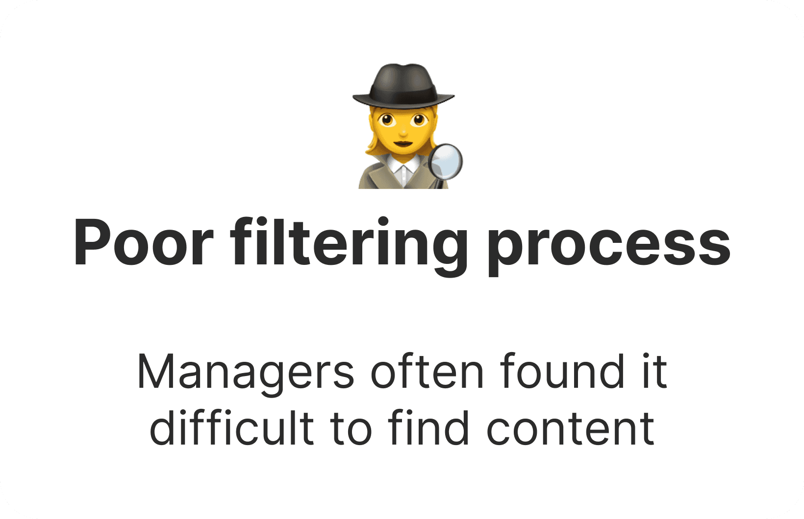 The first screen is the Reflections dashboard, where users can access all reflections-related content. For managers with many direct reports, this view often became overwhelming. All content was housed in the same space, and the limited filtering options made it difficult to quickly find specific submissions.