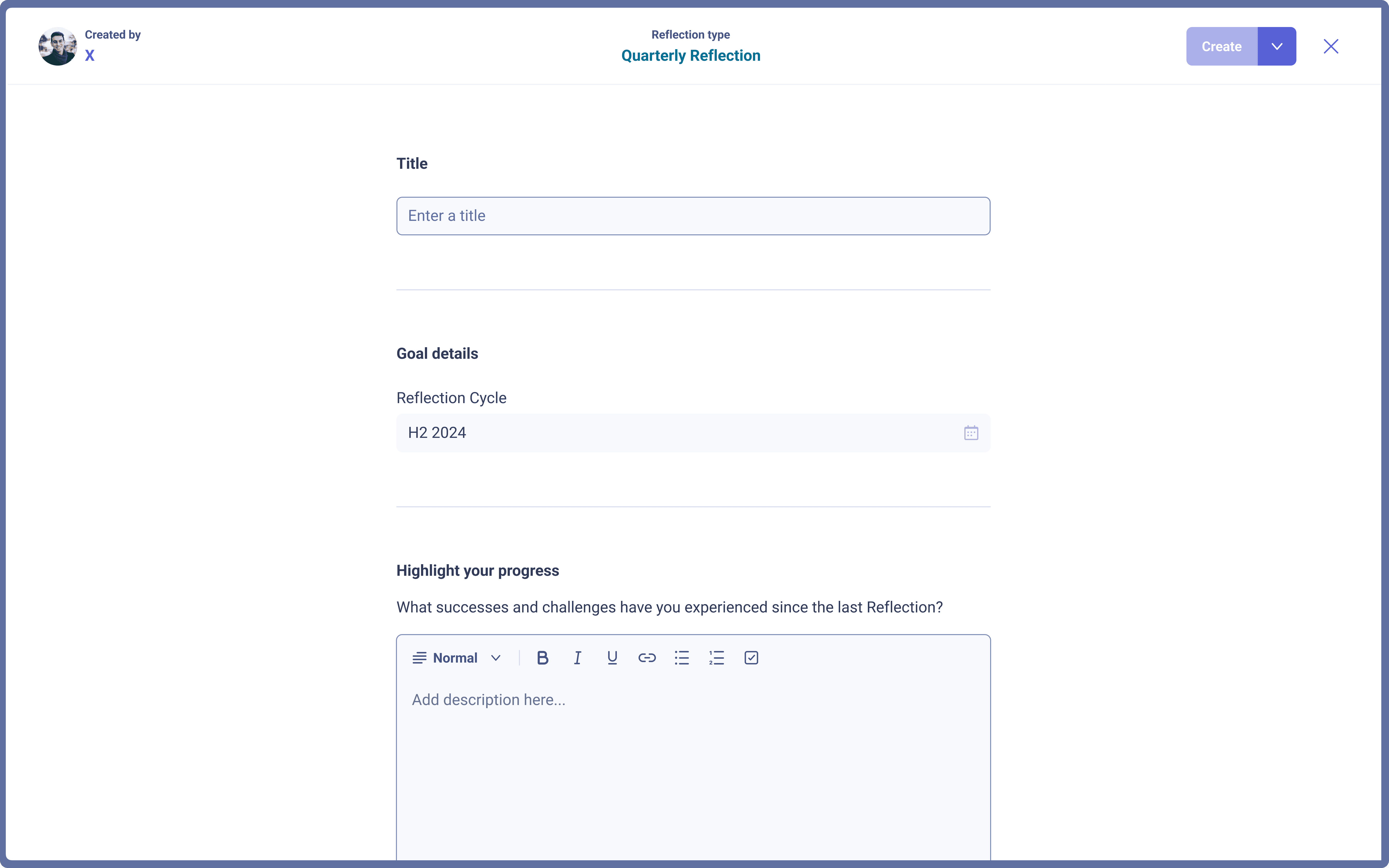Below are the key screens from a typical people leader’s journey. This flow shows the steps a user would take to create a quarterly reflection within the product.